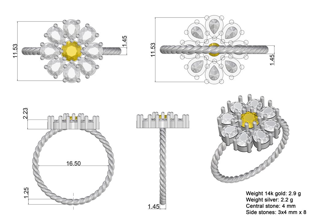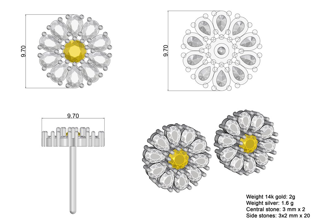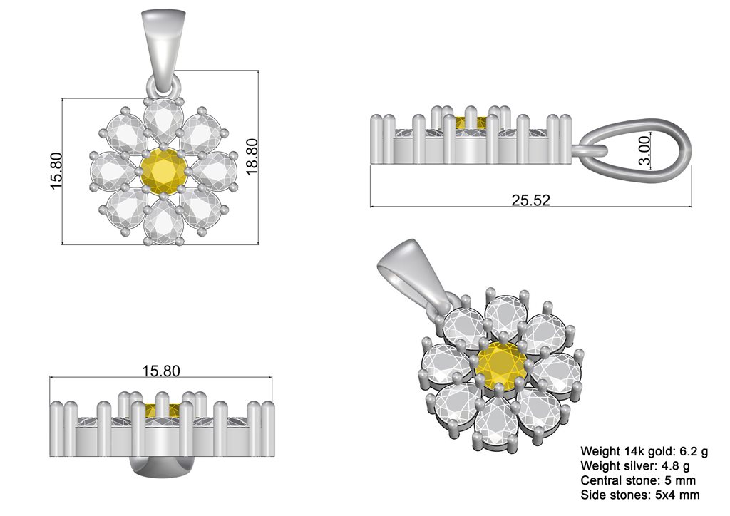 | Popis | Prsten, přívěsek a náušnice s motivem květu sedmikrásky. |