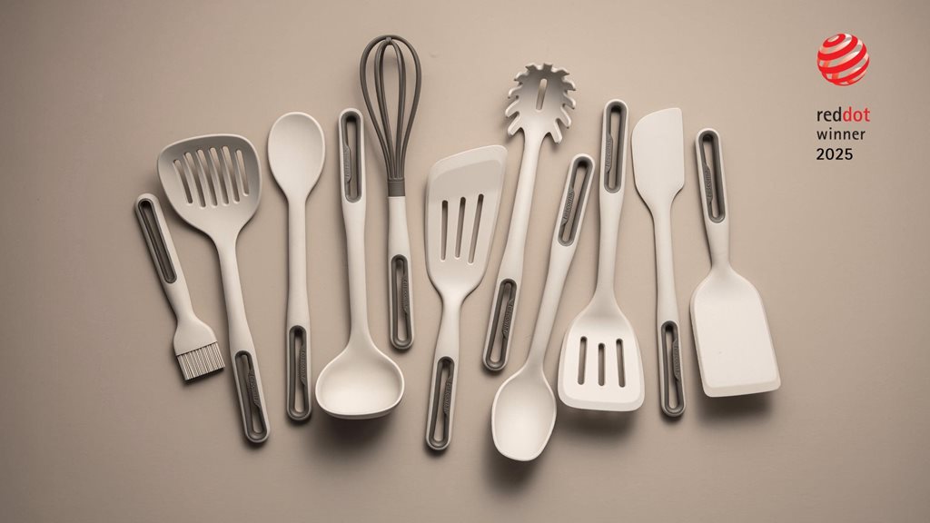 | Popis | Design kompletní sady náčiní na vaření. Design a konstrukci jsem musel přizpůsobit netradičnímu použití materiálů. Povrch tvoří měkký silikon, tuhost dodává jádro z nylonu. Kombinace materiálů a berev se odkrývá v místě rukojeti. |