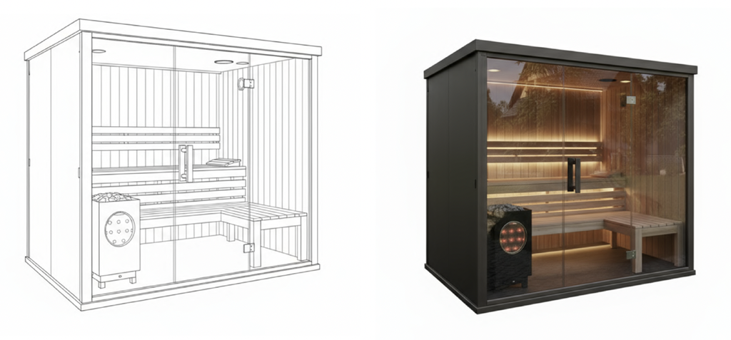 | Popis | Vytvoření kompletního designu panoramatických saun a saunových doplňků, včetně fotorealistických vizualizací. Sjednocení procesu od přesného zaměření prostoru přes 2D půdorysy a parametrický 3D model až po finální výrobní dokumentaci. Díky realistickým výstupům bylo dosaženo výrazného zkrácení schvalování návrhů a minimalizace vícenákladů na stavbě. Vizualizační postupy byly využity jako klíčový podklad pro prezentaci a prodej saun na míru, stejně jako pro získávání nových B2B spoluprací. |