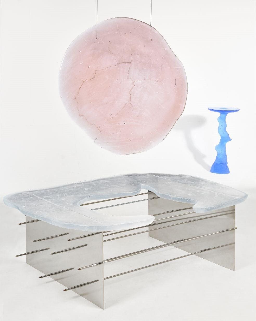 | Popis | Kolekce Flow se skládá ze dvou odkládacích stolků, nástěnného objektu a konferenčního stolku. Je inspirována hlavní fyzikální vlastností skla – jeho tekutostí. Objekty jsou ručně modelovány a významnou roli při jejich vzniku hrají náhodné procesy v peci, které zaručují, že každý kus je originál. |