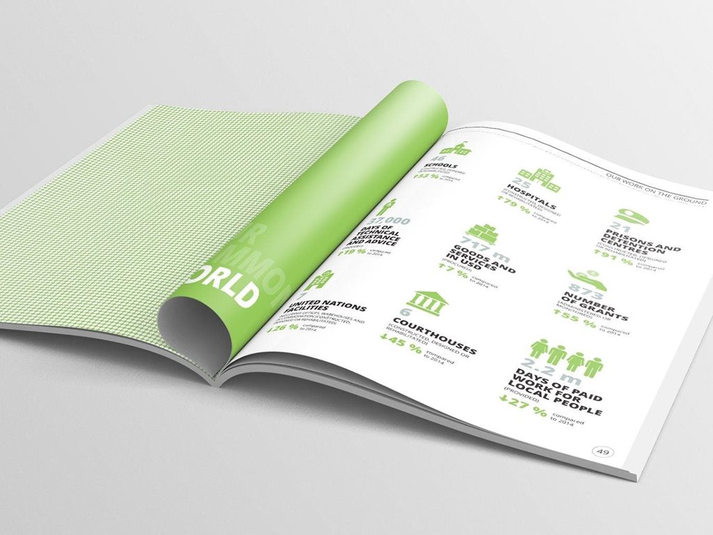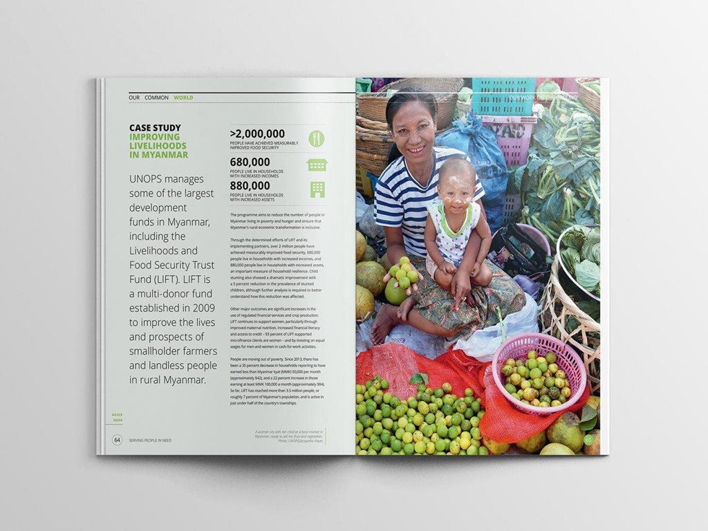 | Popis | V roce 2016 jsme vytvořili design a zlom první zprávy o udržitelnosti pro OSN,"Our common world" pro UNOPS. Vyvinuli jsme kompletní design zprávy včetně komplexní infografiky a dodali soubory připravené pro tisk pro všechny její jazykové verze: angličtinu, španělštinu a francouzštinu. |