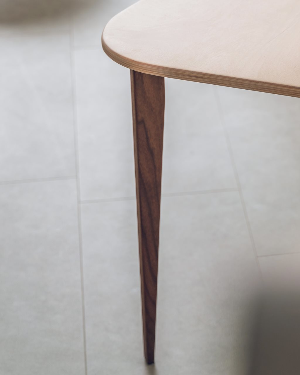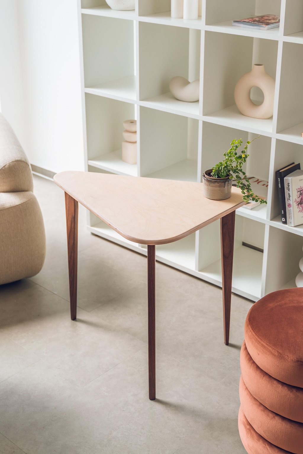 | Popis | Odkládací stolek TRIANGl vznikl materiálovým řešením březové překližky v kombinaci s americkým ořechem pro Braider Any – braider salon v Českých Budějovicích. Upcyklace zbytků amerického ořechu od výroby lokální truhlárny dovolila vytvořit kontrastní kousek se zaměřením na prokouknutí vizuální identity salonu. |