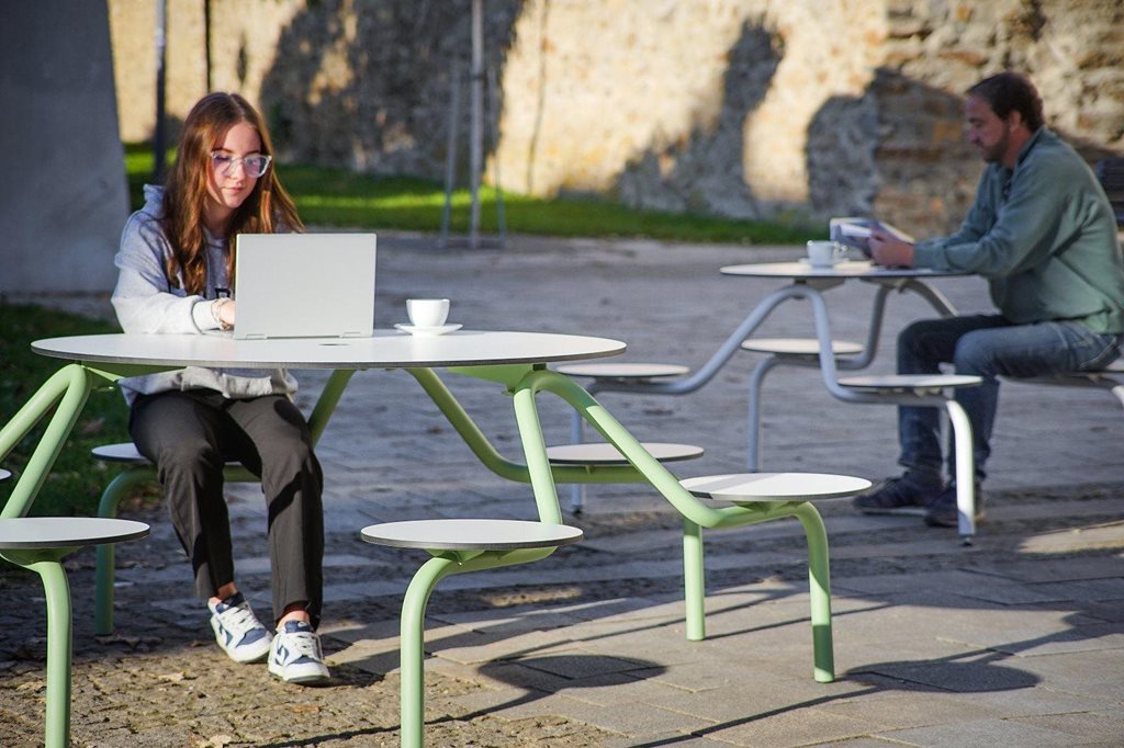 Popis Navrhli jsme modulární systém venkovního sezení, který oživí veřejná prostranství a propojí estetiku s funkčností. Díky odolné konstrukci zvládne jakékoli počasí, snadno se přemisťuje a skladuje. Vhodný pro městské parky, náměstí, kavárny i firemní zóny. Kombinace dřevěných ploch a kovového podnoží umožňuje variabilní barevné provedení. Stůl je vybaven otvorem pro slunečník.