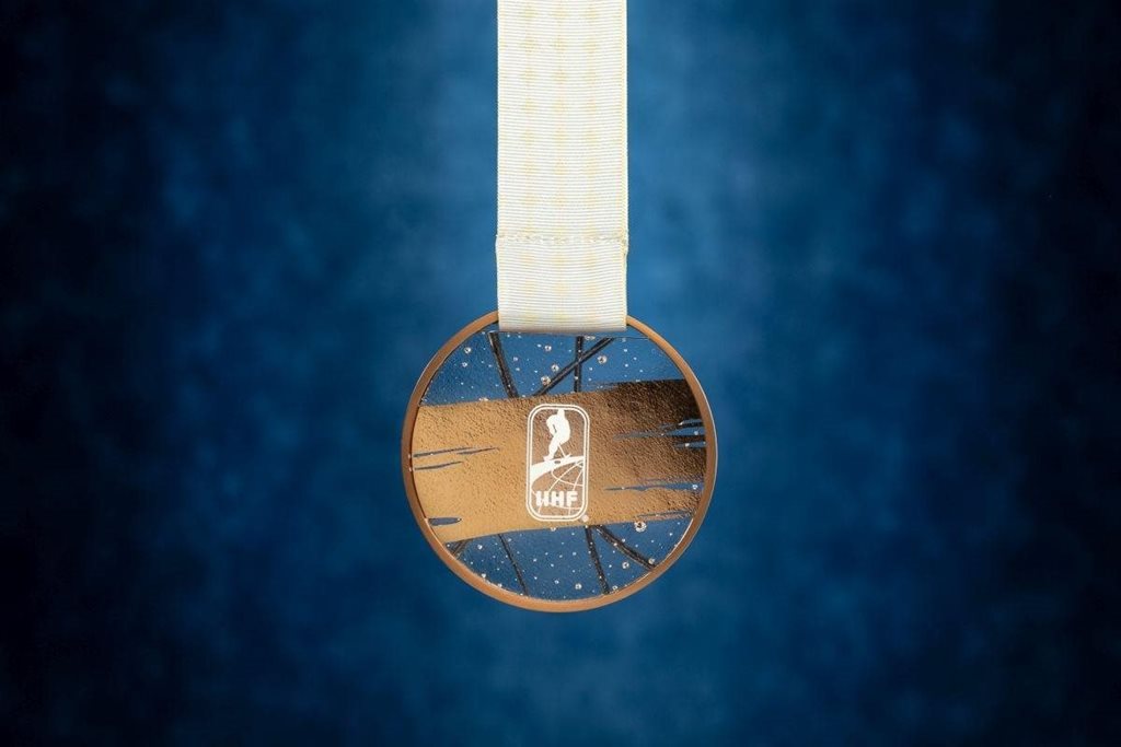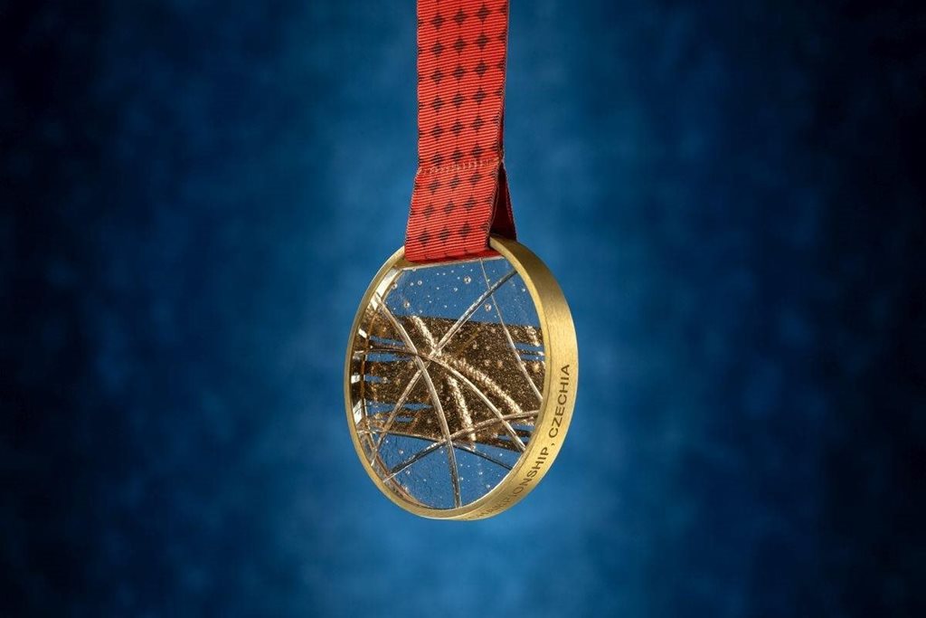 | Description | Medaile z mistrovství světa v ledním hokeji 2024 jsou kombinací tradičního českého řemesla a podstaty ledního hokeje. Jsou vyrobeny z vrstveného, leštěného křišťálového skla, vzdávají hold bohatému dědictví českého sklářství a zároveň symbolizují ledovou hrací plochu, ostré řezy na povrchu skla znázorňují rozbruslení ledu během zápasu . Kovový prstenec připomíná mantinely obklopující kluziště, stuhy pak využívají vizualitu MSLH 2024. |