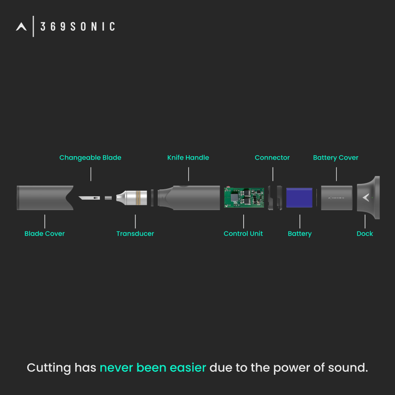 Description A fully mobile, cordless knife with newly developed miniaturized ultrasonic technology built directly into the knife body. Developed in 2 variants, a kitchen knife and alternatively as an industrial cutter.