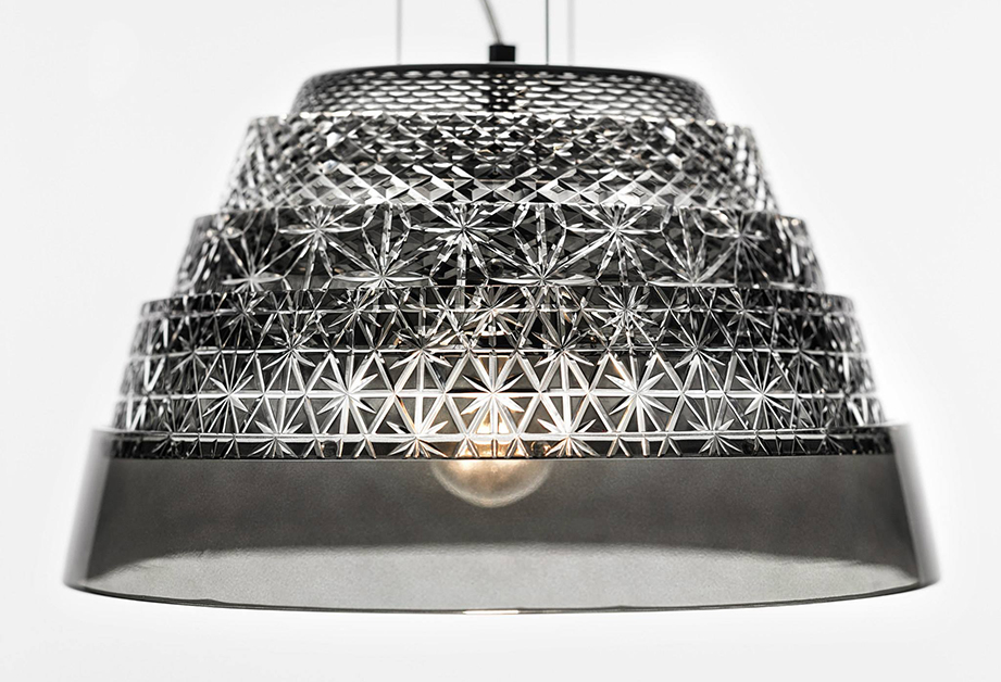 | Description | This luminary is created with five slightly conical and interlocking bands, which when collapsed look like a set of five concentric circles. By expanding and hanging them, a simple shape divided with horizontal lines is formed which can be accentuated with colorful tones or cuts. Designed for Preciosa Lighting. |