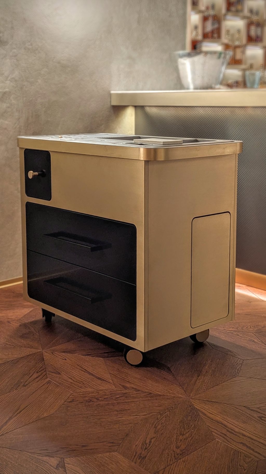 | Popis | Design a konstrukce vozíku pro servírování drinků. S úložnými prostory pro přesně daný typ a počet sklenek. Pro hotel Pupp a jeho bar Splendid. |