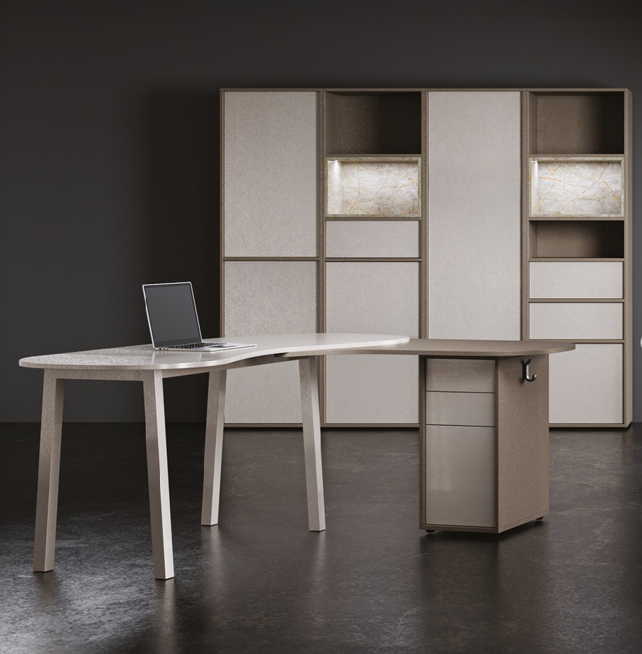 | Popis | Návrh kolekce nábytku pro kancelářské prostory ve futuristickém provedení. Kolekce obsahuje skříně a skříňky s bezúchytkovým provedením a řadu pracovních stolů se zaoblenou stolovou deskou. |