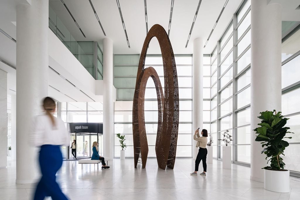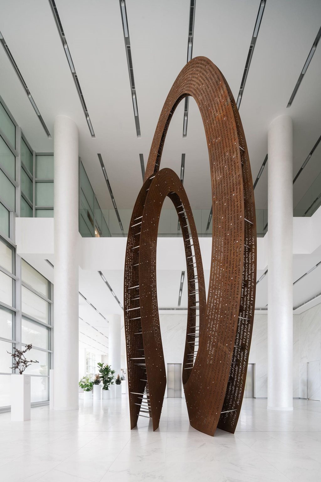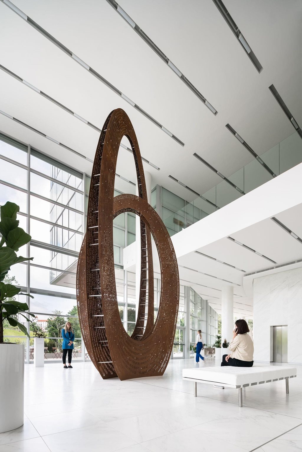 | Popis | Skulptura je volným zamyšlením nad dílem významného básníka Janko Kráľa, jehož jméno nese park sousedící s budovou. Elegantní tvar díla je tvořen rafinovanou smyčkou. Její geometrie si pohrává se myslí pozorovatele: Ačkoliv z některých úhlů pohledu navozuje dojem dvou samostatných částí, tvoří ji dvě “oka” jednoho plynoucího nekonečného pruhu. Dílo z dáli působí masivním dojmem a divák vnímá především celek a jeho harmonickou geometrii. Při bližším pohledu se do vnímání zapojí perforace a pozorovatel objevuje nový rozměr - částečnou průhlednost, která v určitých směrech vyvolá moiré efekt. Zvědavost přivede člověka až do těsné blízkosti. V detailním pohledu se z otvorů stávají písmena plynoucí po celé ploše. Tvar díla možná připomíná jakýsi portál či mohutnou bránu. Z jiného úhlu je spíš mimozemským artefaktem. Nebo představuje dramatickou provázanost Janka a panny z básně “Zakliata panna vo Váhu a divný Janko”, jejíž text je do plochy vtištěn? Broušený povrch kovu kontrastuje se světlým charakterem prostoru a záměrně na sebe strhává pozornost, díky čemuž vytváří přirozený orientační bod. V záhybech tvaru se mísí odlesky slunce, oblohy a budovy s náznaky tváří jejích návštěvníků. Dva k sobě propojené pláty se pak z různých úhlů pohledu ztrácí a díky tomu tvar není těžkopádný, ale naopak dochází k jeho vizuální redukci. Těžiště sochy zůstává průchozí a divák tak může vstoupit přímo do jejího středu, podstaty, centra dění. |