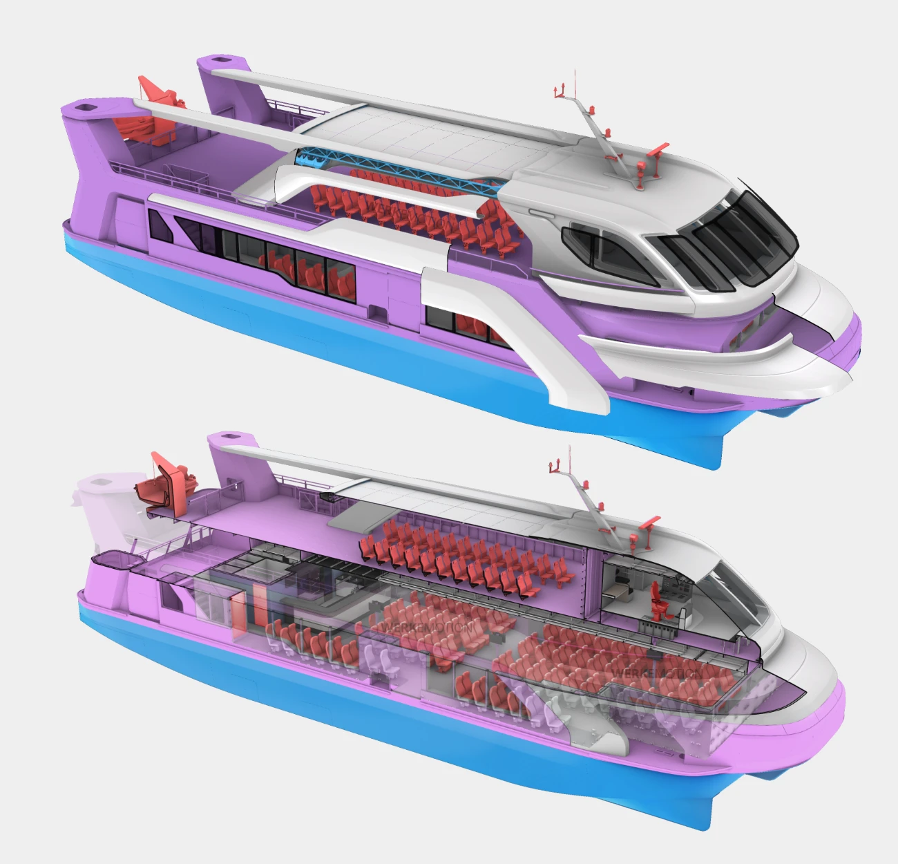| Popis | WERKEMOTION design studio navrhlo flotilu dvou nejmodernějších katamaránů a dvou trajektů, pro Maďarské jezero Balaton. Jeden z největších lodních projektů ve středí a východní Evropě představuje významný krok v úsilí o modernizaci námořních služeb jezera Balaton. Projekt byl realizován ve spolupráci s Belgickými inženýry MULTI engineering a byl vyroben ve Slovenské loděnici Komárno. Pro stavbu lodí s kapacitou 300 lidí byly využity nejmodernější technologie, jejíž design i výrobní data byly zcela v režii naší firmy. Zároveň jsme navrhli interiérový design celé flotily včetně kapitánského můstku i vyřešili jsme takzvaný fit-out - tedy výběr a oslovení dodavatelů pro zařízení interéru. Od sezóny 2024 lodě úspěšně operují na Maďarském jezeře Balaton. |