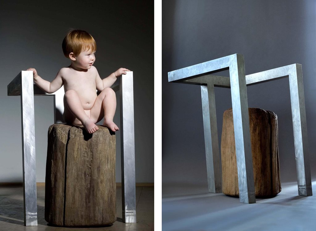 Description Utility object (chair) for Baby Club Juklik. The assignment was: create an object that will have a useful value and that will be closely connected to water. The stump, which is part of the chair, was pulled out of the weir of the river, where it was "shaped by the water" for months.