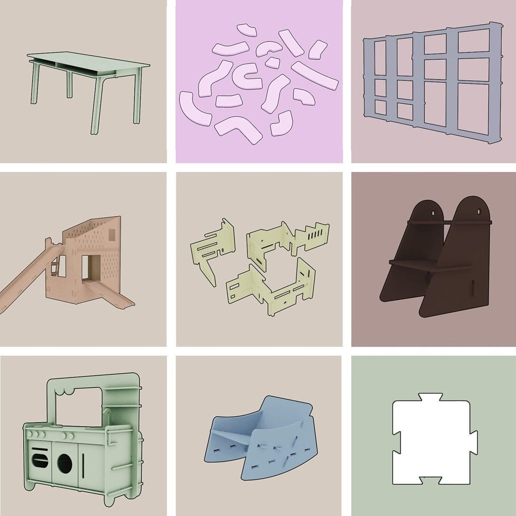 | Description | Own project of simple furniture, interior accessories and toys. The individual parts are precise pieces of birch plywood machined on a CNC machine, which are connected without additional metal components by simply sliding into each other. |