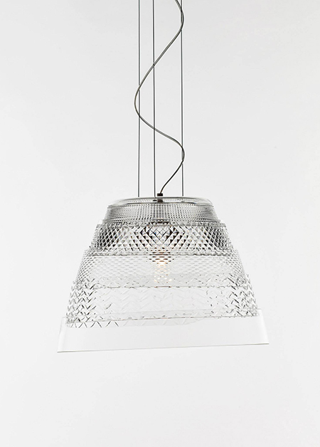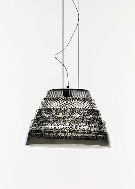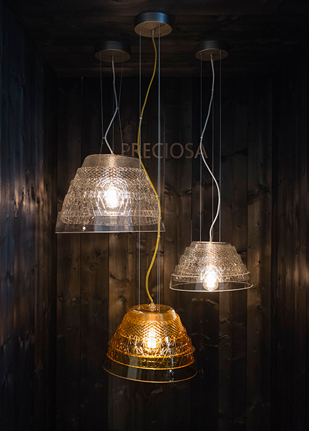 | Description | This luminary is created with five slightly conical and interlocking bands, which when collapsed look like a set of five concentric circles. By expanding and hanging them, a simple shape divided with horizontal lines is formed which can be accentuated with colorful tones or cuts. Designed for Preciosa Lighting. |